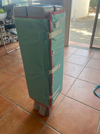 Es muy ligera y fácil de montar. Sin estructura metálica. Fácil de llevar, como un bolso. Con dos bolsillos para pañales, toallitas, etc. Se puede usar de cambiador. Usada un fin de semana. En camping. Cualquier información que necesitéis, preguntadme sin problema. Gracias