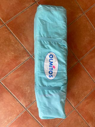 Vendo cuna de viaje portátil de la marca Olmitos. Está en buen estado, aunque tiene algunas marcas de uso. - Incluye una colchoneta acolchada con diseño infantil. - Se pliega fácilmente para guardarla en su bolsa de transporte roja. - Ideal para viajes o para tener una cama extra en casa.
