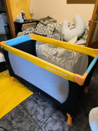 Cuna de viaje plegable marca Dream n Play, ideal para llevar a todas partes. Fácil de montar y desmontar. Sirve de cuna y de parque. - Estructura resistente. - Laterales de malla transpirable. - Incluye colchoneta. - Color azul y amarillo.