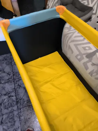 Colchón plegable para cuna de viaje. Es fácil de transportar y es desenfundar para lavarlo. En casa se ha usado para jugar a montar casitas - Color azul y naranja con borde amarillo.