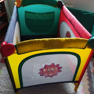 Cuna de viaje plegable con un diseño colorido y divertido. Es fácil de montar y desmontar. - Estructura resistente. - Laterales de malla para ventilación. - Incluye un estampado infantil en uno de los laterales. Está sin estrenar
