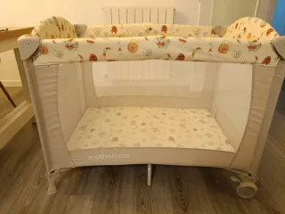 Cuna de viaje de la marca Mothercare, ideal para transportar y usar en diferentes lugares. Su diseño es práctico y funcional. - Estructura plegable. - Laterales de malla transpirable. - Colchón con estampado infantil. Medidas : 95x65
