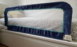 Barrera de seguridad para cama infantil Safety 1rst. Ideal para viajes o uso diario. Se encuentra en muy buen estado. - Fácil de instalar. - Diseño azul marino y verde menta. - Red transpirable.