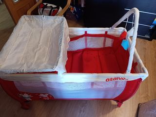 Cuna de viaje plegable Asalvo Baby, ideal para viajes o para tener una cama extra en casa. Está en buen estado y es fácil de montar y desmontar. - Plegable para facilitar su transporte y almacenamiento. - Estructura resistente y ligera. - Tejido de color rojo y gris. - 4 laterales de malla - 2 patas con freno - Resistente al agua No incluye colchón.