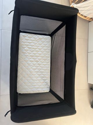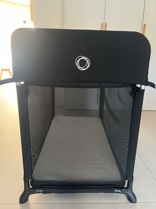 Cuna de viaje Bugaboo en color negro. Incluye colchón. - Estructura ligera y plegable. - Laterales de malla transpirable. - Colchón acolchado.