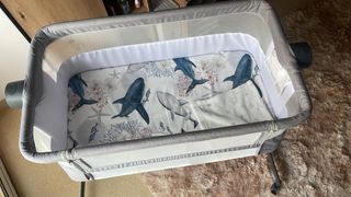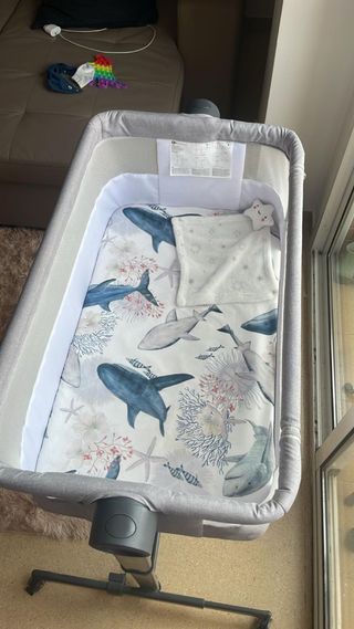 Se vende cuna de viaje con estampado de tiburones y una silla para el coche. - Cuna de viaje con laterales de malla. - Incluye colchón y manta. - Silla de coche compatible con sistema Isofix.