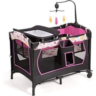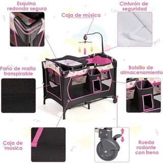 Práctica cuna de viaje con cambiador y móvil. - Diseño en color negro con detalles en rosa y estampado floral. - Incluye cambiador acolchado. - Móvil con figuras. - Bolsillos organizadores laterales.