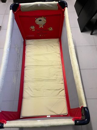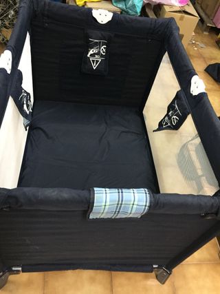 Cuna plegable para bebé, práctica y resistente. De las que solucionan la vida. Medidas abierta: 65,5 × 125,5 cm Incluye colchón plegable firme, que hace también de somier. Qué la hace útil: - Se monta y se pliega en minutos. - Ocupa poco espacio guardada. - Laterales de rejilla transpirable. - Ventana lateral con cremallera. - Bolsillo exterior. - Bolsa de transporte original incluida. Perfecta para: - Casa de abuelos o tíos. - Viajes, camping o segunda residencia. - Tenerla “por si acaso”. Traducción: La dejas en casa de los abuelos y ya no hay excusas para no quedarse al bebé. Tú sales a cenar tranquilo. Buen estado.