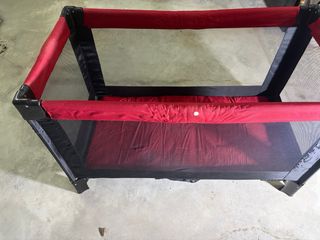 Cuna de viaje marca CENTURY, ideal para transportar. - Estructura de metal y malla. - Acolchado rojo.