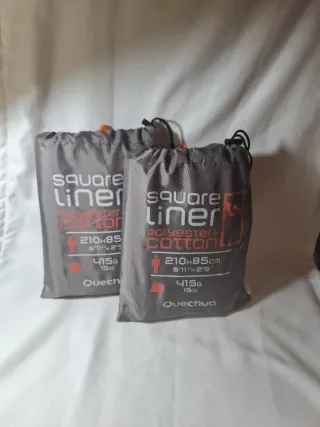 Saco sábana de la marca Quechua, ideal para camping o viajes. - Material: Algodón y poliéster. - Dimensiones: 210 x 85 cm. - Peso: 415 g (15 oz). Tengo 2 unidades el precio es por unidad