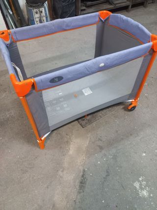 Cuna de viaje para bebé, ideal para viajes o uso diario. Se encuentra en buen estado. - Estructura plegable y fácil de transportar. - Tejido gris y detalles naranjas. - Incluye bolsa de transporte (no se ve en la imagen).