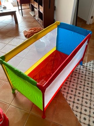 cuna de viaje en perfectas condiciones y muy pocouso. Tiene 2 alturas, un cambiador que nunca se ha usado que se pone en un lado de la cuna, una puerta lateral que se habré y cierra con cremallera para que entre el bebé solo cuando empiece a gatear, un arco con juguetes colgados, un colchoncito para que esté más como. También está la funda donde se mete cuando se cierra y tiene hasta la caja original.