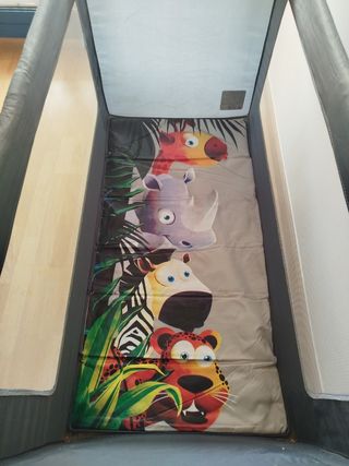 Se vende cuna de viaje de la marca MS. Color gris con dibujos de animales. Se dobla para poder guardar y llevar. Ruedas con frenos. Bolsillos laterales. Bolsa con asas para transportar.