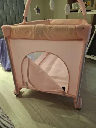 Cuna de viaje, plegable. Casi nueva. Con cambiador y mosquitera, sin estrenar. Ruedas en dos patas. También sirve como parque para que juegue el bebé. Tiene cremallera y puede entrar y salir por la puerta.