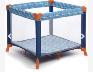 Parque cuna infantil de viaje, ideal para llevar a cualquier parte. Su diseño es práctico y seguro. - Estructura de color azul. - Acolchado con estampado. - Laterales de malla transpirable. Usado pero en muy buen estado, se pliega y se transporta facilmente
