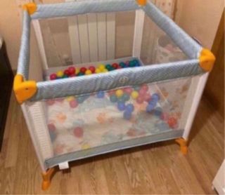También sirve como cuna de viaje,un lateral se abre con cremallera para que el niño pueda entrar y salir solo. La base está desgasta por el uso, por eso regalo las 2 mantas de suelo