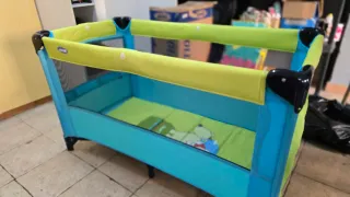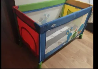 Preciosa cuna de viaje para bebé, prácticamente nueva. Es ligera y fácil de montar, ideal para viajes, para tener una cama extra en casa o de parque de juegos. Solo lo uso un mes. - Estructura resistente y estable. - Tejido de poliéster de color rojo, naranja, azul y verde. - Ruedas para facilitar el movimiento.