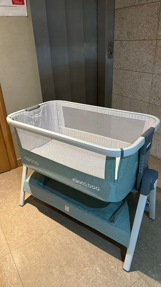 Cuna de viaje KikkaBoo modelo Nanna, de color verde menta. Se encuentra en buen estado. - Laterales de malla transpirable. - Altura ajustable en 6 niveles.