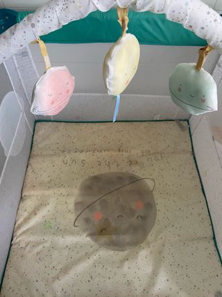 Cuna de viaje de la marca Jane, ideal para llevar a todas partes. Incluye un divertido móvil con peluches. - Diseño con estampado espacial. - Móvil con tres peluches de planetas y estrellas.