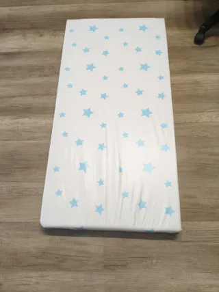Colchón para cuna de viaje con un bonito estampado de estrellas en color azul sobre fondo blanco. Es ligero y fácil de transportar. - Diseño de estrellas azules. - Tejido suave al tacto.
