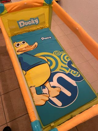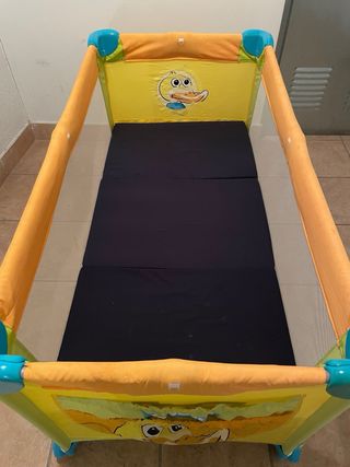 Cama de viaje con un divertido diseño de pato. - Dos niveles de altura - Incluye un colchón extra mas grueso - Estructura de color naranja y azul. - Colchón con estampado de pato. - Ideal para viajes o siestas.