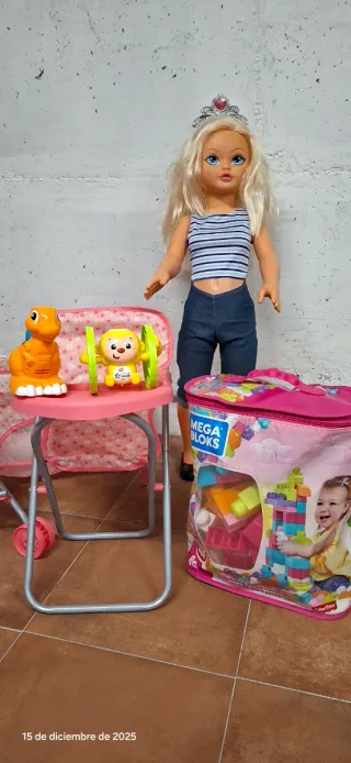 Conjunto de juguetes para niñas y niños que incluye una muñeca extragrande y varios accesorios de bebé y juego Mega Blocs de Fisher- Price de 80 piezas. Todo nuevo, sin usar. - Cuna de viaje rosa con estampado. - Silla de paseo rosa. - Trona rosa con muñeco bebé. Y selección de juguetes de regalo.