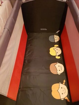 Bonita cuna de viaje en muy buen estado que se puede utilizar de parque para que el bebé juegue cuando es más grande. Tiene una pieza que hace que cuando el bebé es recién nacido que no se mueven pueda estar más alto para comodidad de los padres. También tiene un cambiador y además tiene una puerta en un lateral para que cuando el bebé sea más mayor pueda entrar y salir cuando quiera para jugar con sus juguetes. Se plega y queda como una bolsa, lo que hace que se pueda transportar muy bien.