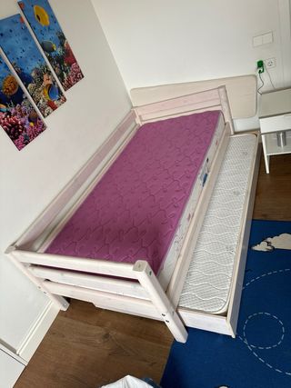 Cama original FLEXA modular, válida tanto como cama baja como en versión semi-alta, incluye patas elevadoras, escalera lateral y tobogán. Fabricada en madera maciza, muy resistente y estable. Ideal para habitación infantil y para aprovechar el espacio inferior como zona de juego o almacenaje. Está completa y totalmente funcional. La estructura es firme, presentando únicamente desgaste estético normal de uso en la pintura (roces y marcas visibles en las fotos), sin afectar en absoluto a su uso ni a la seguridad. Precio pack completo: 100€. (Nueva supera los 500 €.) Se vende estructura. No incluye colchón ni elementos decorat