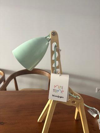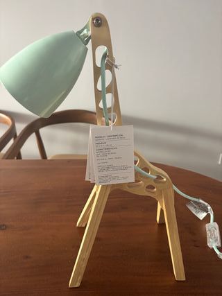 Preciosa lámpara de mesa con forma de jirafa, ideal para una habitación infantil. Está en perfecto estado. Flexo infantil . - Lámpara de sobremesa con diseño de jirafa. - Pantalla de color verde menta. - Material: Madera y metal. - Medidas: 30 x 17.5 x 46 cm. - Bombilla de 8W (no incluida) Es una lámpara flexo monísima para decorar