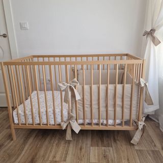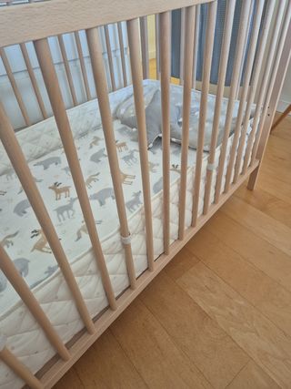 Cuna de madera de Ikea, ideal para el descanso del bebé. Su diseño sencillo se adapta a cualquier habitación. - Estructura de madera clara. - Laterales con barrotes. - Ahora mismo está en modo colecho, también dispongo de los otro barrotes. - Colchón Ecus ( precio nuevo 65€)