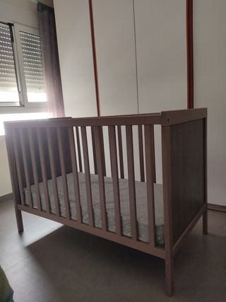 Cuna modelo Sundvik de Ikea en color marrón. Se encuentra en buen estado. - Estructura de madera. - Barra para quitar un lateral y convertirla a colecho. - Colchón en buen estado incluido.