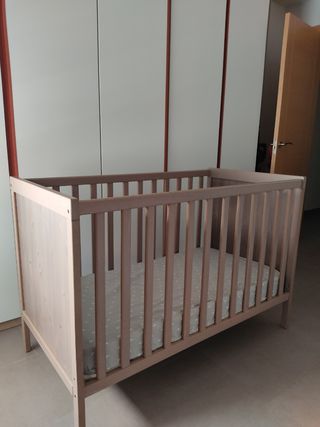 Cuna modelo Sundvik Ikea. Colchón comprado a parte, de buena calidad 60x120. Se puede poner a dos alturas según la edad del bebé. Uno de los lados de la cuna se puede retirar la barrera y se hace una especie de cama para cuando el niño sea mas grande. Hecha por mi para ponerla en modo colecho, con el kit comprado a parte, se aprecia en una foto. Inlcuye 2 bajeras y chichonera