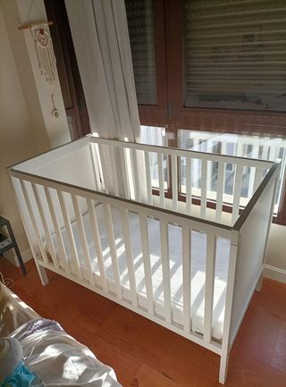 Comprada en 2023. Cuna blanca Ikea Sundvik en perfecto estado, lista para usar. Tiene dos posiciones, en la baja se puede quitar un lareral para hacerlo cama. Tiene hechos un par de agujeros extra en la posición superior para poder usarla de colecho (se ve en la foto) Incluye dos colchones, el intermedio y el fino de Ikea.