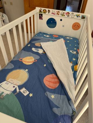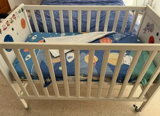 Se vende cuna de bebé de Ikea, en buen estado, junto con su colchón, protector de colchón y un juego de sábanas de funda nórdica (no incluye nórdico). - Cuna de madera blanca con vinilos decorativos para hacer una cuna única para tu bebé. - Colchón incluido. - Juego de sábanas de funda nórdica. - le pusimos ruedas para poder mecer la cuna está usada pero prácticamente nueva porque hacíamos más colecho que usar la cuna.