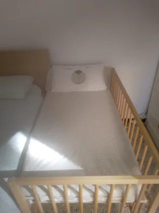 Cuna de madera de IKEA con colchón incluido. Ideal para colecho. Refuerzo incluido quitar un latetal. - Estructura de madera clara. - Colchón transpirable. - Incluye sabanas hechas a medida - Cuna sin estrenar comprado hace 4 meses. *solo venta en persona.