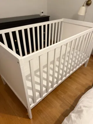 Se vende cuna modelo Sundvik de Ikea junto con su colchón. - Cuna de madera blanca. - Colchón con funda. - Diseño nórdico y funcional. Además, se regalan sábanas, edredón, funda de edredon y el protector chichones. La cuna no se ha usado, solo se montó a modo colecho pero está al completo y en muy buen estado