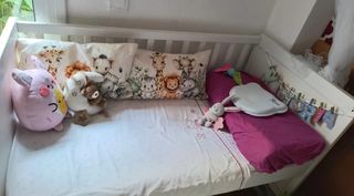 Cuna modelo Sundvik de Ikea, se vende completa. El único desperfecto es ese agujero a cada lado que lo hice porque la puse de colecho un tiempo, y un taco que tiene roto en unos de los agujeros pero no influye para nada. Lo que incluye: - Estructura de cuna - Colchón como nuevo porque usamos uno y este es el segundo - barrera de cuna para cuando se haga tipo cama (como en la foto) - protector colchón - chichonera - funda nórdica puntitos de sokios - relleno nórdico Tengo también sábanas y otra funda nórdica de un león. Cualquier duda consultad