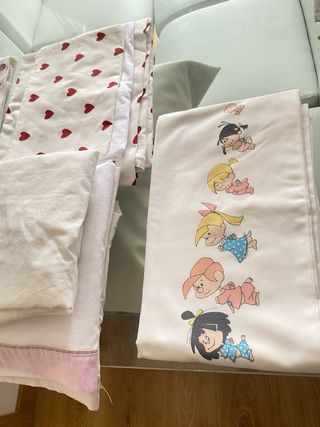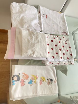Lote de sábanas de cuna y fundas para nórdico, se incluye: la de corazones es de Ikea y no se ha llegado a estrenar, pero se le cortaron las etiquetas, es funda nórdica más almohadón y bajera blanca, bajera con estrellas, funda y almohadón de animales si le das la vuelta tiene otro estampado tipo floral, sábana y almohadón de la familia Telerin, 3 bajeras blancas de Ikea, 2 bajeras blancas de Zara Home, también se incluye 2 sábanas de cuna colecho, todo está en foto.