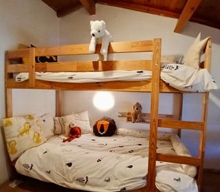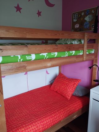 Estructura de litera en madera. Una buena solución si tienes poco espacio. Ideal para dormitorios juveniles. Muy poco uso. ✔ Medidas: 90 x 200 cm. ✔ Estructura principal de pino macizo. Muy sólida. Escalera integrada que puede montarse tanto a la izquierda como a la derecha de la estructura. ✔ Se incluyen el somier de láminas y colchón de espuma de 90 x 200 cm. valorado en 70 € de cada litera #cama #ikea #niños