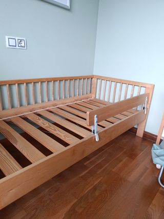 Cama infantil de Ikea en madera de haya, con somier y barandilla de seguridad. - Medidas: 70x160 cm. - Material: Madera de haya. - Incluye somier. - Incluye barandilla.