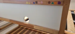 Está en buenas condiciones. Con algún signo de uso y una pegatina. Se puede pintar en la zona blanca con tizas y se limpia fácil. Hemos usado la cama de las dos formas. La vendemos porque ya no cabe debajo el peque. Posibilidad de venderla sola o también con el escritorio smastad de Ikea y la cajonera con 3 cajones (Las dos cosas 60€ más) Más 2 colchones topper de ikea que costaron 99€ cada uno, costaron 198€ en total. Están practicamente nuevos y tienen funda. Los dos por 50€ El total de la litera + escritorio + mueble cajonera + 2 colchones topoer: ¡ Todo por 200€ ! Hay que venir a recogerlo Medidas en la última