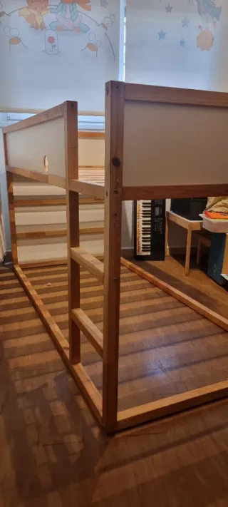 Cama Kura de IKEA, ideal para habitaciones infantiles. Su diseño permite aprovechar el espacio. - Estructura de madera. Tiene un circulo hecho debido a que iba apoyada en un radiador. Se entrega desmontada. Somier laminado si esta montado