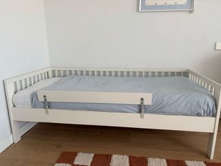 -Cama con somier Ikea sniglar N 191.854.33, 70x160cm -Colchón underlig N°303.393.92 -Protector impermeable colchón lenast N°704.457.91 -Almohada vildkorn 50x60cm N°904.605.87 -Barandilla nattapa N°504.657.61 -Edredón 4 estaciones 150x200cm smasporre N° 904.585.89 -2 fundas nordicas 150x200cm con fundas de almohada 50x60cm -1 funda de almohada 50x60cm -Manuales de instrucciones y llaves de montaje. Todo muy cuidado y en perfecto estado. Precio original 273€.