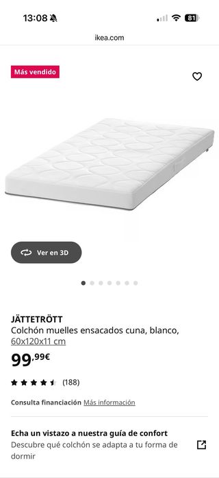 Mejor Colchón para cuna JÄTTETRÖTT de Ikea en color blanco. NUEVO a ESTRENAR, nunca se ha usado, comprado en Septiembre. - Se regala Funda blanca colchòn valorada 20 euros. - Muelles ensacados. - Medidas: 60x120x11 cm.