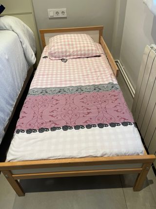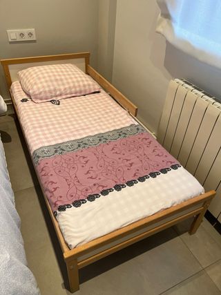 Cama infantil de IKEA en buen estado. Ideal para habitaciones de niños. - Estructura de madera. Medidas: 165x75cm - Incluye somier, colchón de 160x70cm y juego de sábanas