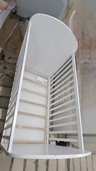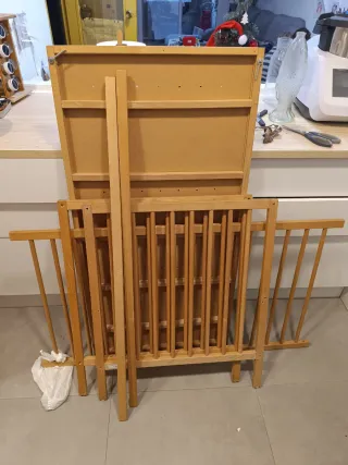 Cuna de madera de Ikea, con un diseño sencillo y funcional. - Estructura de madera clara. - Laterales con barrotes. - Uno de los laterales se puede quitar para hacerlo cama. Sólo está dañado un poco la tela que cubre la base de la cuna pero aguanta perfectamente. La tengo desmontada.