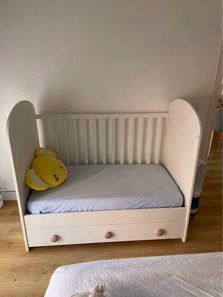 Cuna infantil modelo Gonatt de Ikea, con un diseño moderno y funcional. Precio nueva 260e. - Estructura de madera de color blanco. - Convertible a cama infantil - Incluye cajón amplio para almacenamiento. - Tiradores redondos de madera. El colchón se vende a parte, colchón marca lémur anti plagiocefalia de alta calidad con funda protectora con un valor de 200e, se vende por 50e.