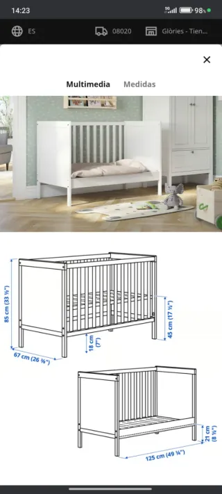 Cuna de IKEA con un diseño clásico y funcional. Perfecta para el descanso del bebé. - Medidas: 85 cm (alto) x 67 cm (ancho) x 125 cm (largo). - Altura del somier: 18 cm (7). - Altura de las patas: 21 cm (8 ¼). - Altura del lateral: 45 cm (17 ¼).