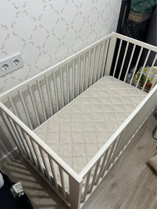 Cuna de bebé de la marca Ikea, en color blanco. Solo tiene una posición. Incluye: - Colchón 120cm x 60cm - 2 sábanas bajeras - 2 cubre colchón impermeable ajustable - 1 edredón - 2 fundas de edredón con funda de almohada - 2 protectores de barreras La cuna tiene algunos pequeños golpes propios del uso, pero que no afecta al funcionamiento. La medida de la estructura de la cuna es 125cm x 65cm. Se entrega desmontada