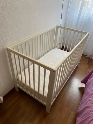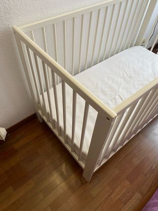 Cuna de la marca Ikea, modelo Smägöra, en color blanco. - Medidas: 60 x 120 cm. Está en perfecto estado sin ningún rasguño. el colchón está impoluto sin ninguna mancha. Regalo protector de colchón y sábanas bajeras así como la colcha de la base.